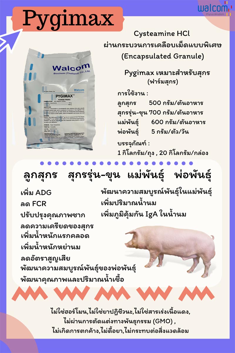 PYGIMAX คือ สารที่เติมเสริมในอาหารสัตว์ เหมาะสำหรับสุกร (ฟาร์มสุกร) ส่วนประกอบหลักคือ Cysteamine HCl ที่ผ่านกระบวนการเคลือบเม็ดแบบพิเศษ (Encapsulated Granule) ซึ่งทำงานผ่านระบบต่อมไร้ท่อที่เกี่ยวข้องกับกระบวนการเมทาบอริซึมของร่างกายสัตว์, ช่วยลดบทบาทการทำงานของฮอร์โมนโซมาโตสแตติน (Somatostatin Hormone) ส่งผลให้ Growth Hormone ทำงานได้มีประสิทธิภาพ และลดการหลั่งฮอร์โมนความเครียดหรือคอลติซอล (Cortisol) การใช้ PYGIMAX จึงช่วยปรับปรุงสมรรถภาพการผลิตสุกรได้โดยตรง โดย PYGIMAX ไม่ใช่ฮอร์โมน, ไม่ใช่ยาปฎิชีวนะ, ไม่ผ่านการตัดแต่งทางพันธุกรรม (GMO), ไม่ใช่สารเร่งเนื้อแดง, ไม่เกิดการตกค้าง, ไม่ดื้อยา และไม่ส่งผลกระทบต่อสิ่งแวดล้อม